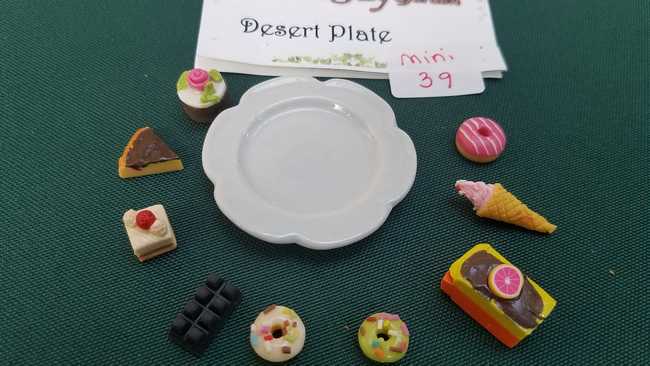 A pretty white porcelain platter loaded with 9 pieces of resin miniature colorful sweets. Ice cream cone, chocolate bar, delicious donuts, and tiny cakes. A variety of treats for your tiny guests!
