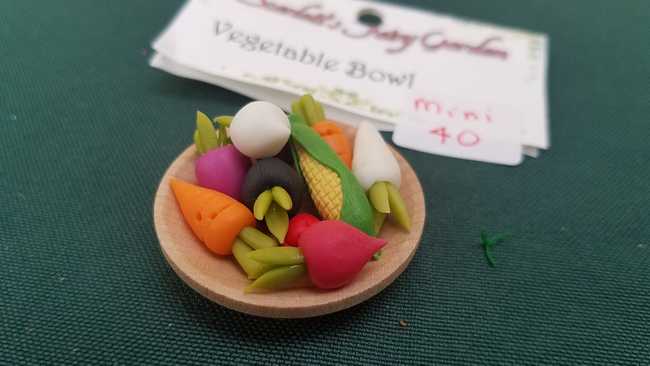 small wood bowl holds a 10 piece assortment of fresh tasty vegetables. Place this on a tiny table in your fairy garden for your forest fairies to munch on. A healthy snack for all!
